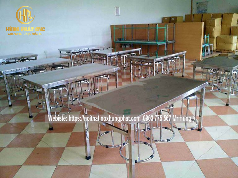 | Bàn Ăn Ghế Liền | Ghế được gắn liền với khung bàn, tiết kiệm diện tích, dễ dàng vệ sinh sàn nhà. | Bếp ăn công nghiệp, nhà máy, công ty. |